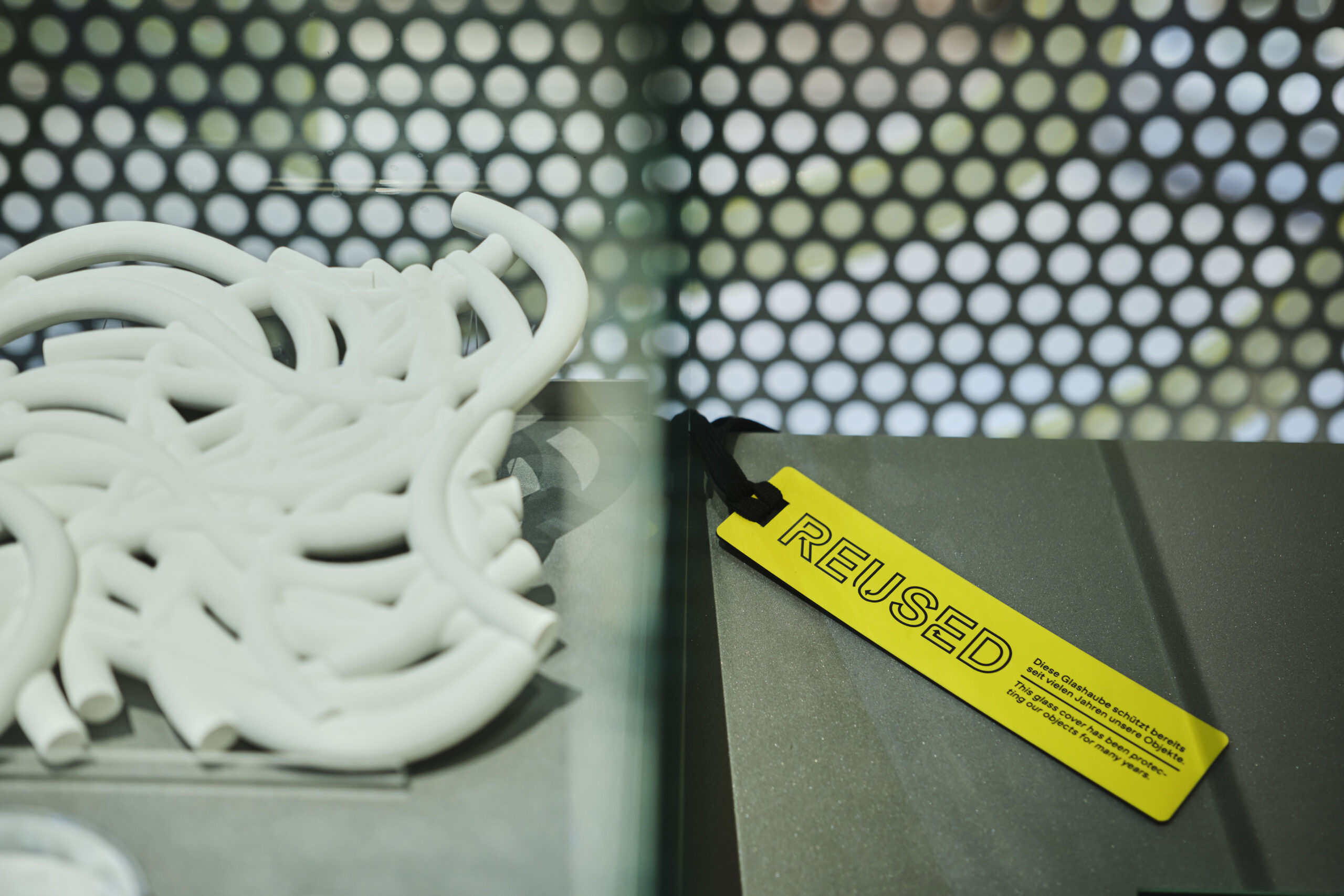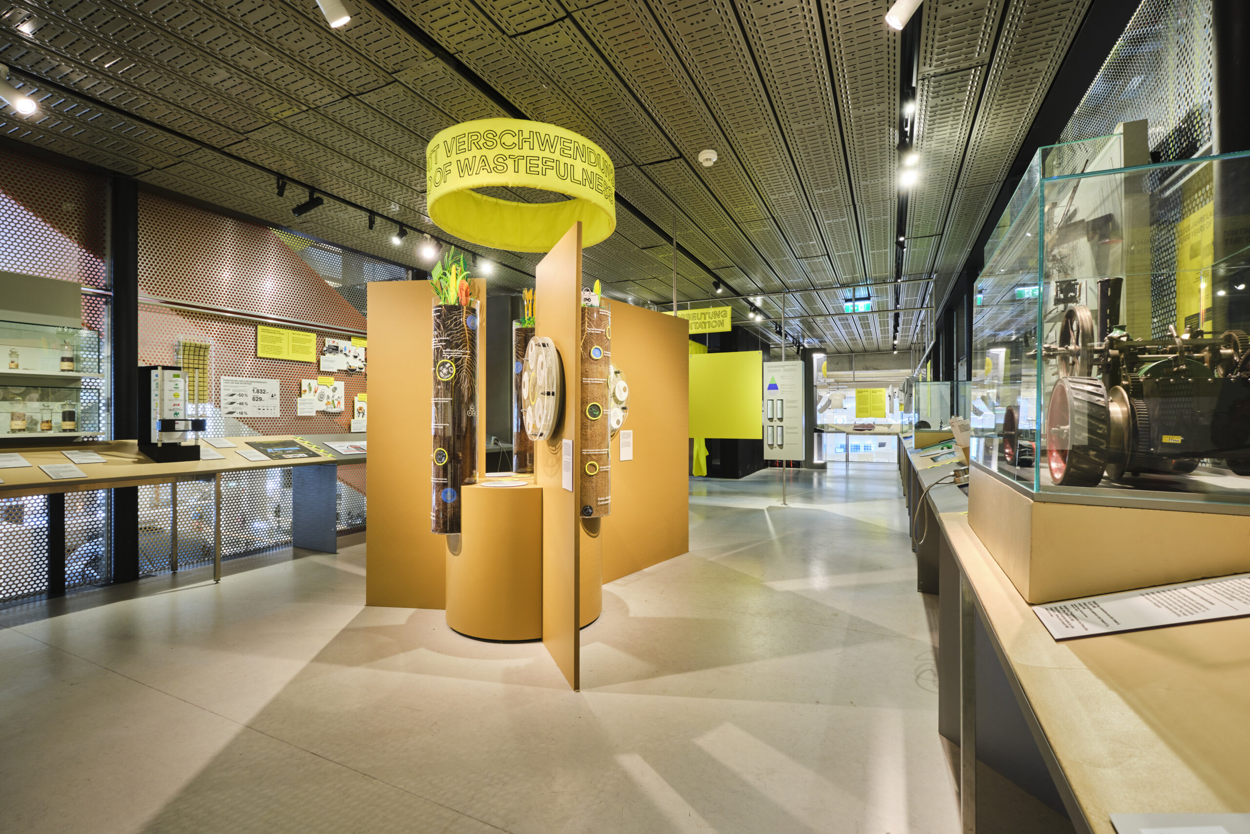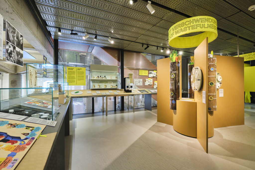 Besonders bei Sonderausstellungen fällt durch den Umbau oft viel Abfall an. More than Recycling setzt bewusst auf nachhaltige Konzepte: Neuanschaffungen wurden minimiert, vorhandene Objekte und Möbel aus früheren Ausstellungen wiederverwendet und angepasst, und nachhaltige Baustoffe verleihen der Architektur ein individuelles Erscheinungsbild, das sichtbar macht, wo Altes neu kombiniert wurde.