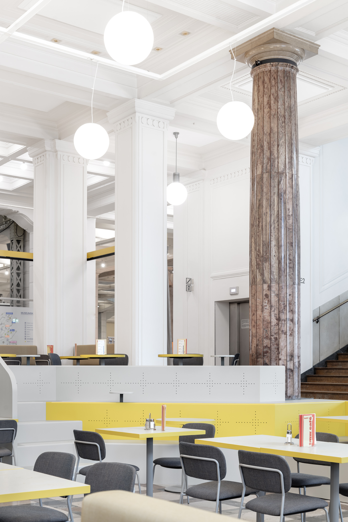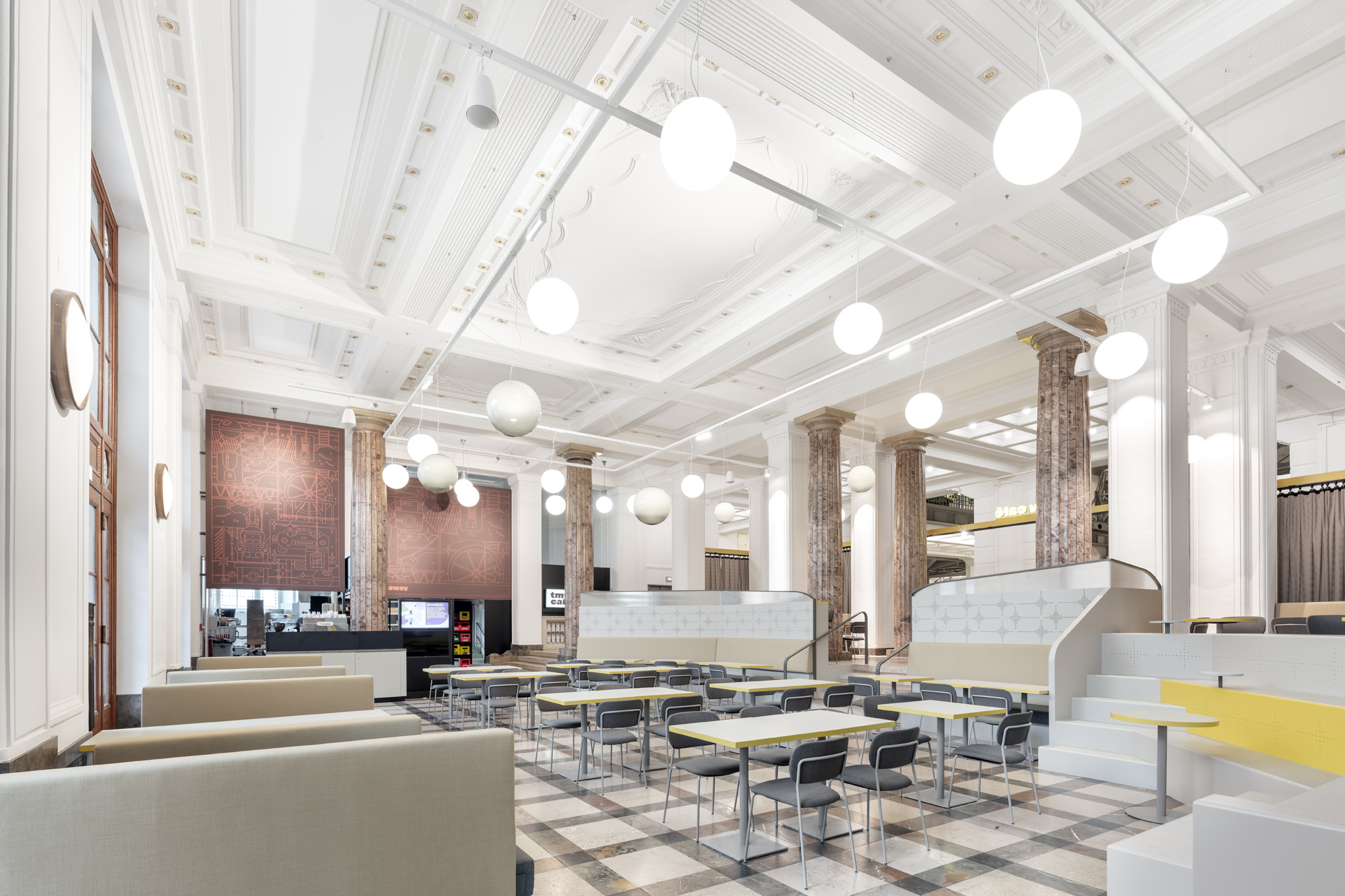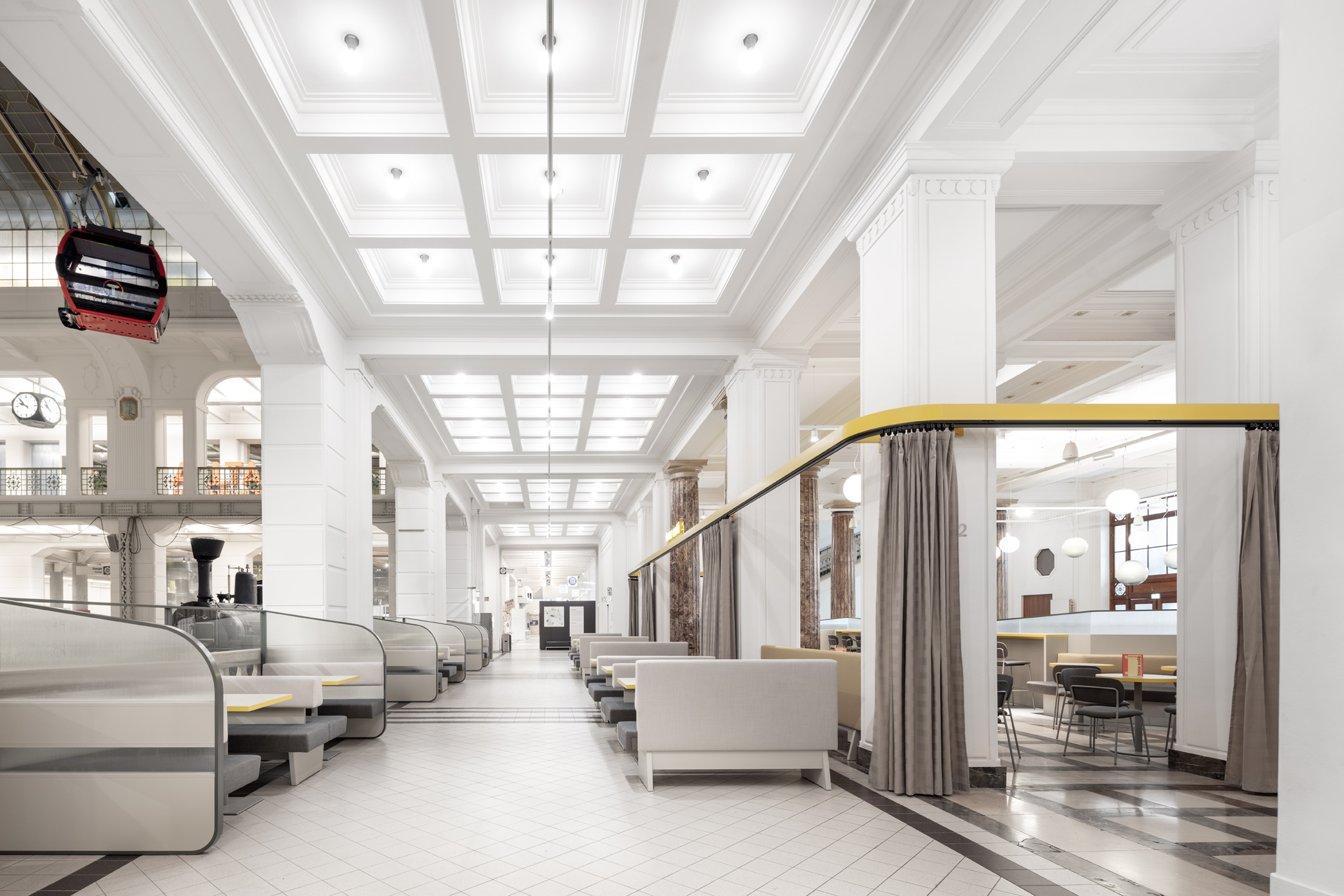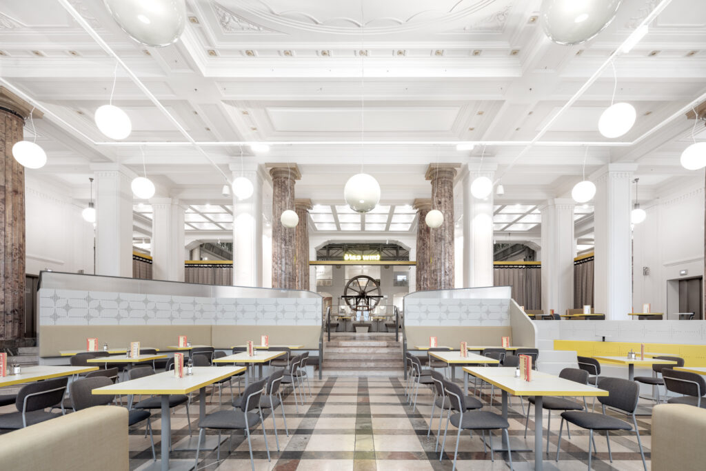Das TMW Café verwandelt die historische Eingangshalle des Technischen Museums Wien in einen offenen, vielseitigen Raum über zwei Ebenen – mit Bereichen für Familien, Restaurantgäste, Lounge und Picknick.