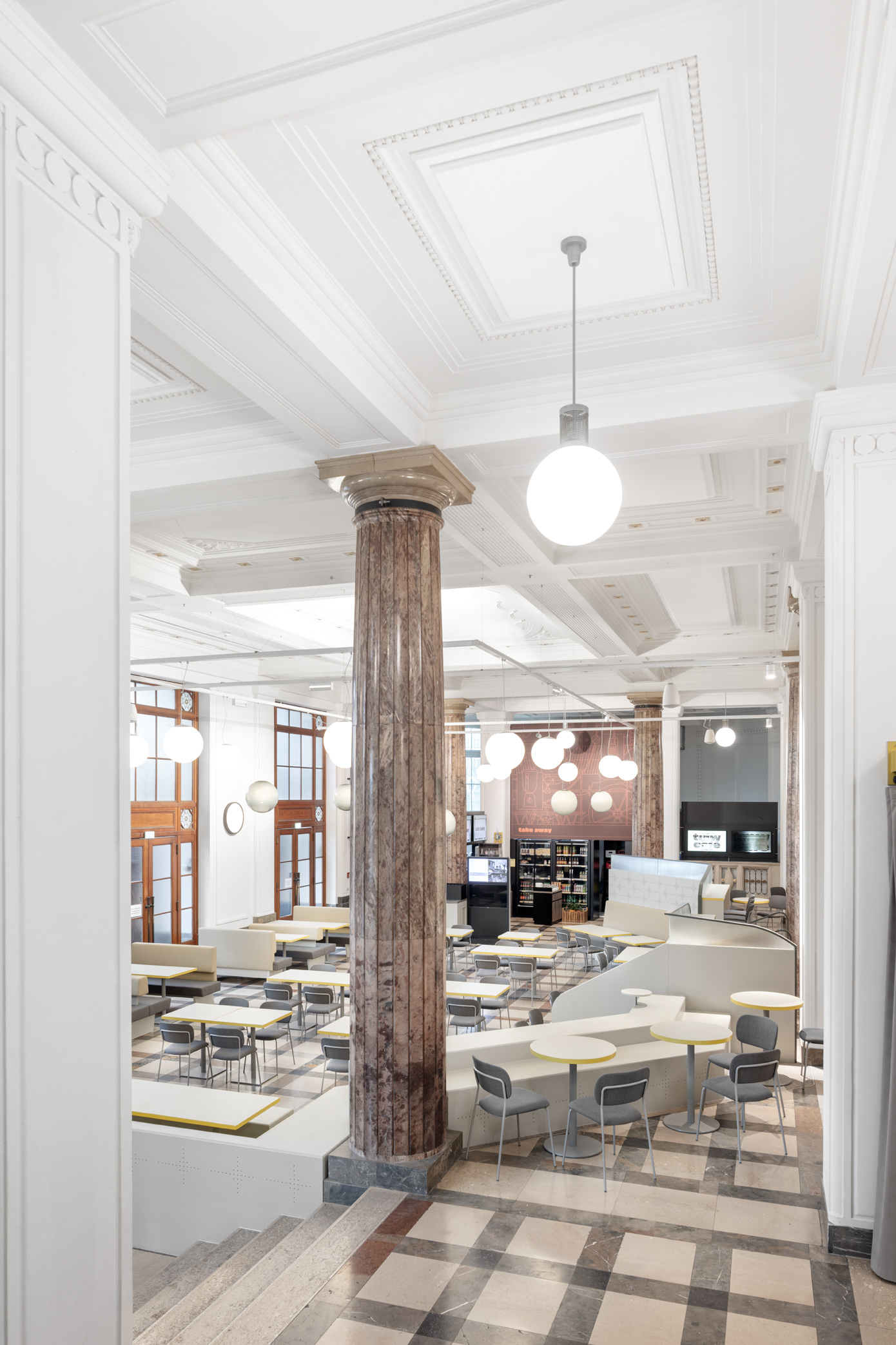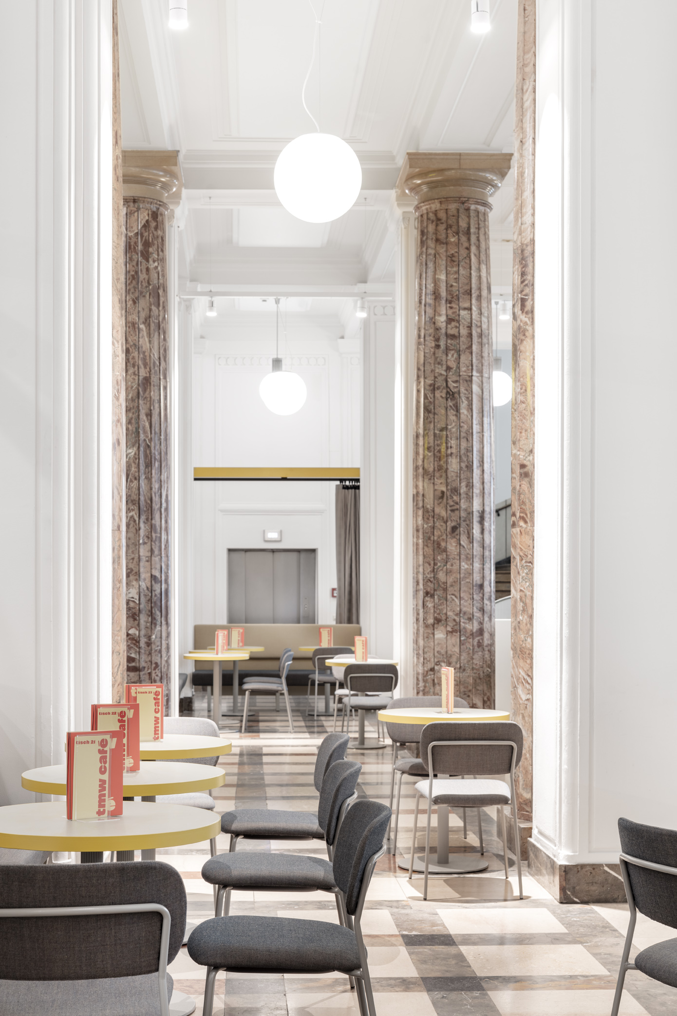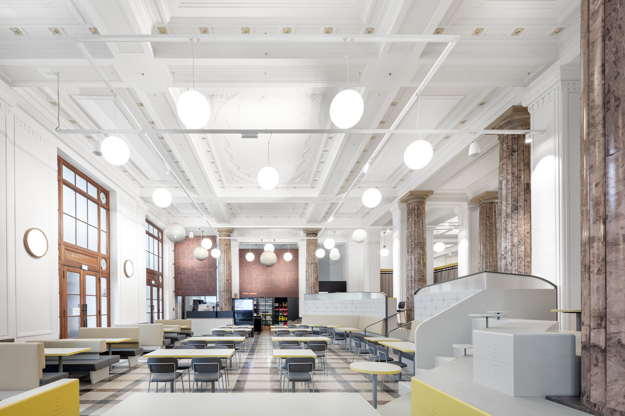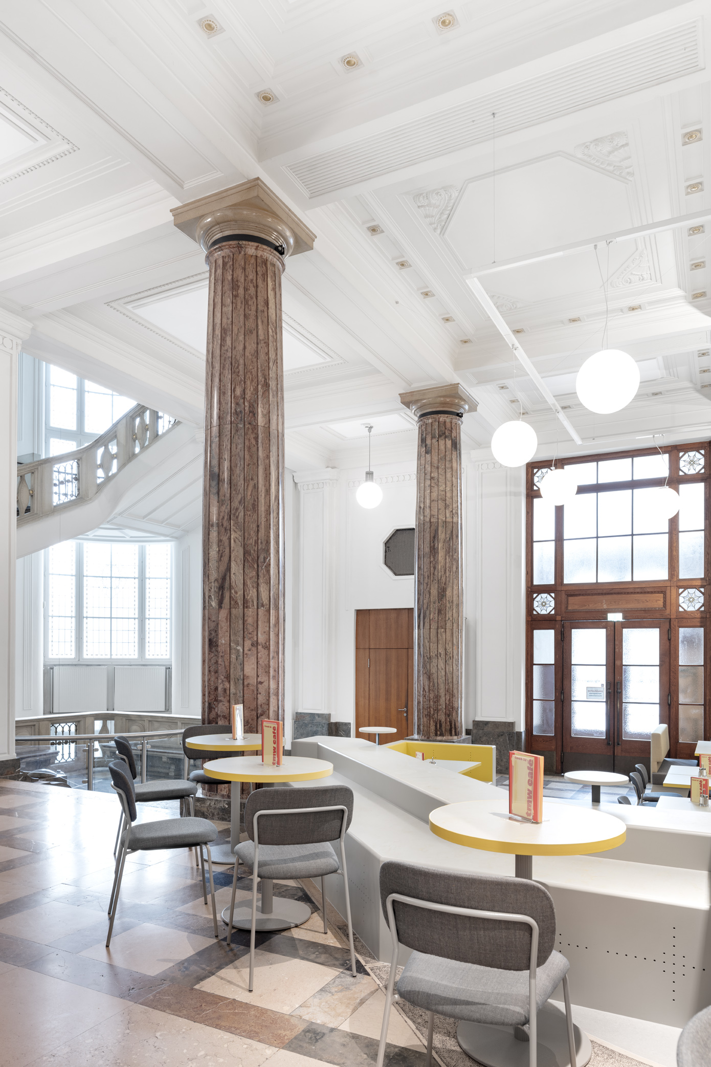 Das TMW Café verwandelt die historische Eingangshalle des Technischen Museums Wien in einen offenen, vielseitigen Raum über zwei Ebenen – mit Bereichen für Familien, Restaurantgäste, Lounge und Picknick.