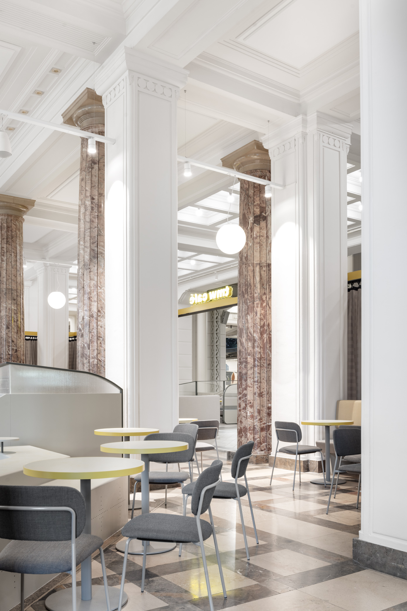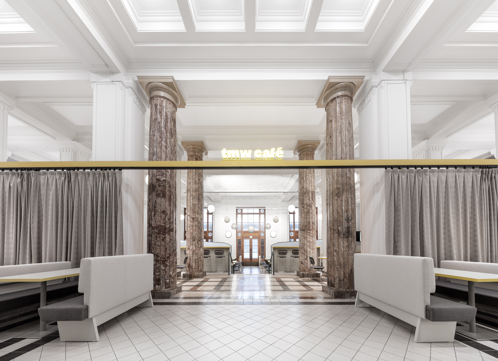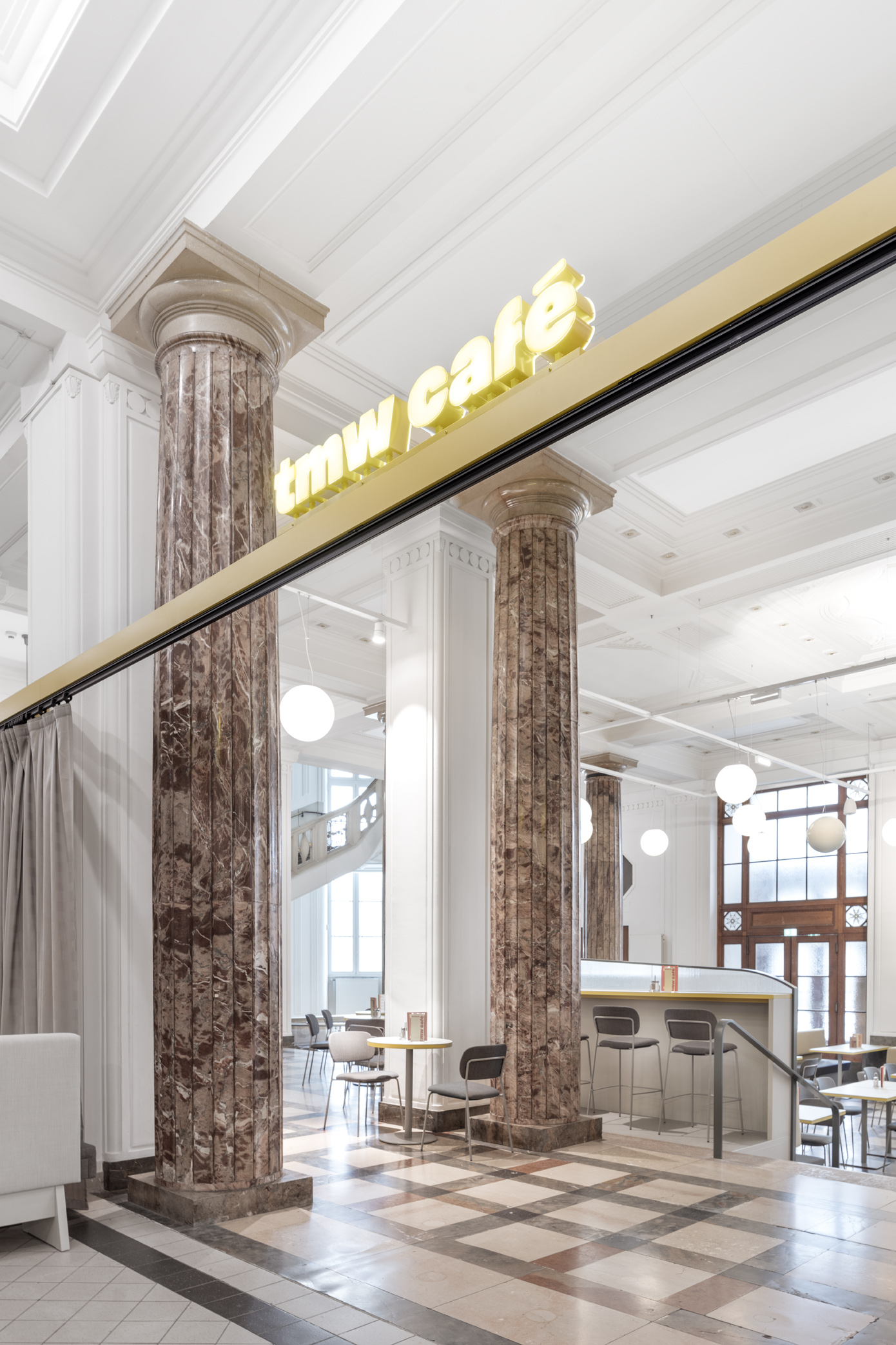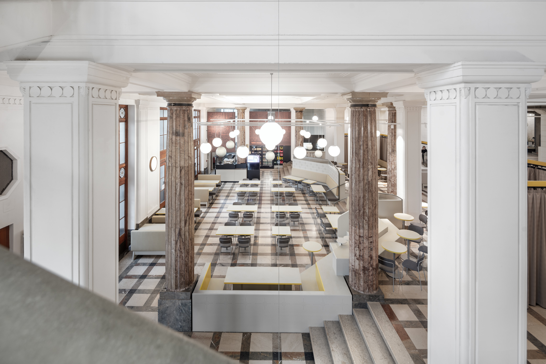 Das TMW Café verwandelt die historische Eingangshalle des Technischen Museums Wien in einen offenen, vielseitigen Raum über zwei Ebenen – mit Bereichen für Familien, Restaurantgäste, Lounge und Picknick.