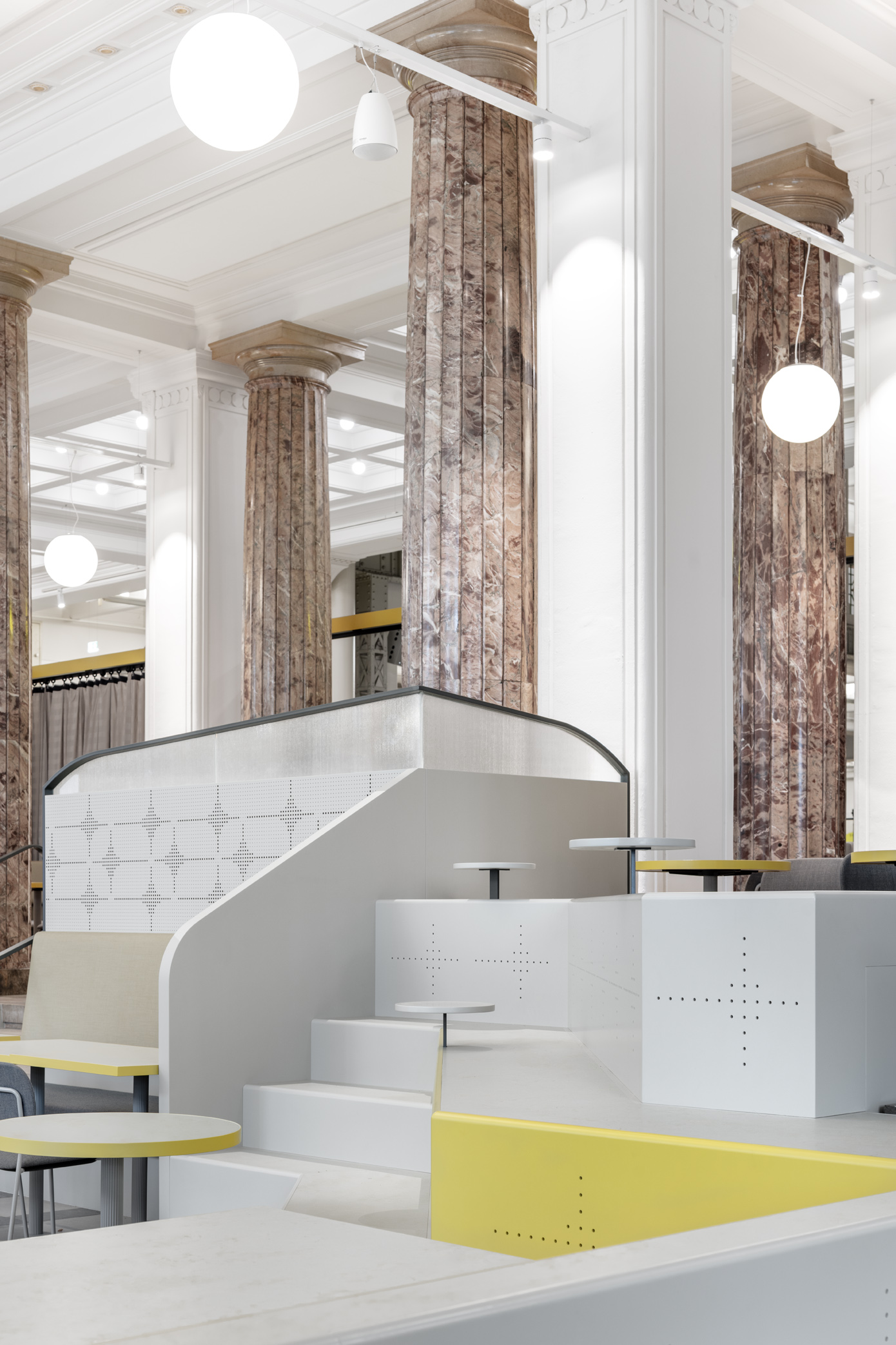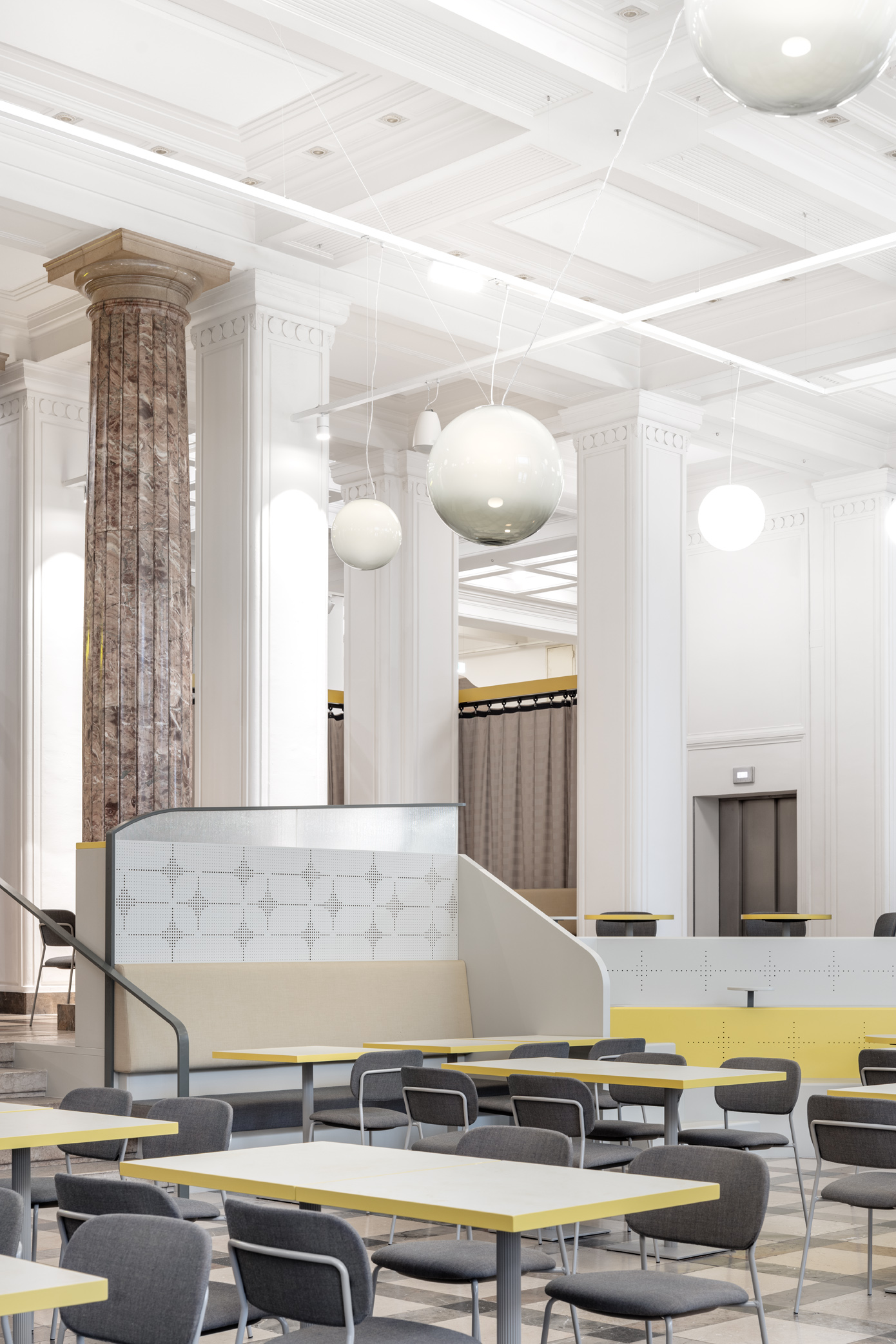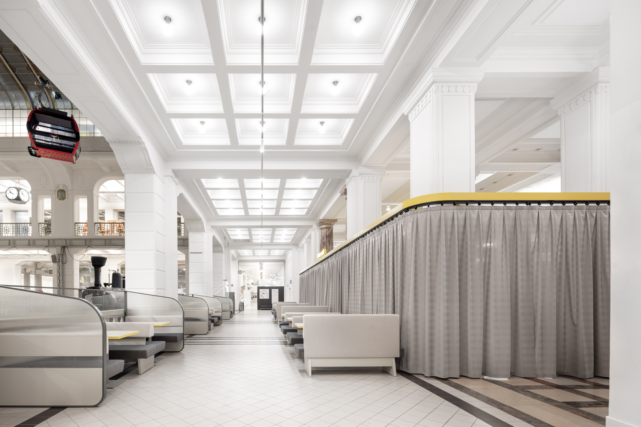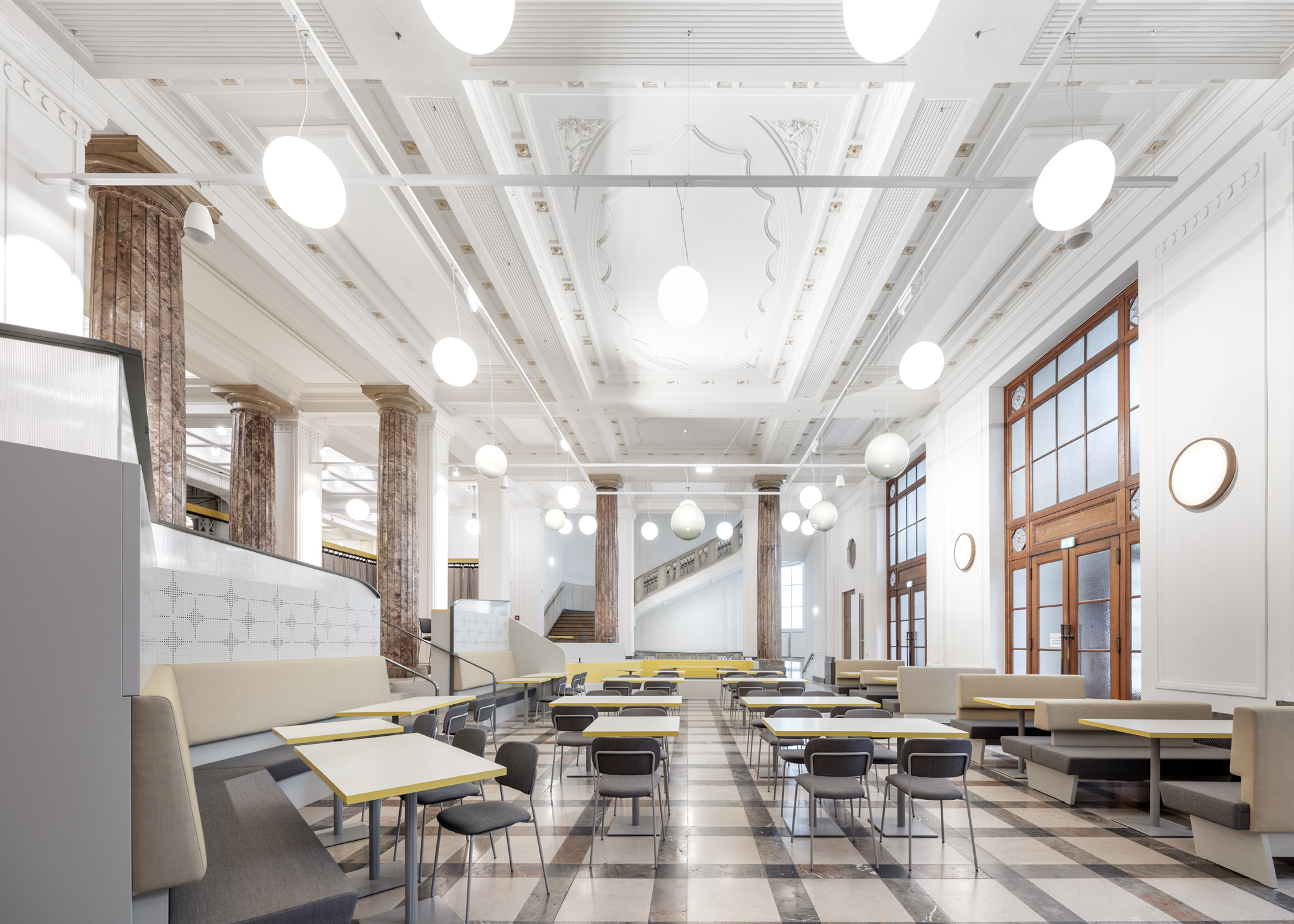 Die Stufenbank bildet eine flexible Familienzone, die unten auch als Sitzbank für Geburtstagsfeiern genutzt werden kann. Verglaste Dinernischen bieten Rückzugsmöglichkeiten mit Blick in die Haupthalle.